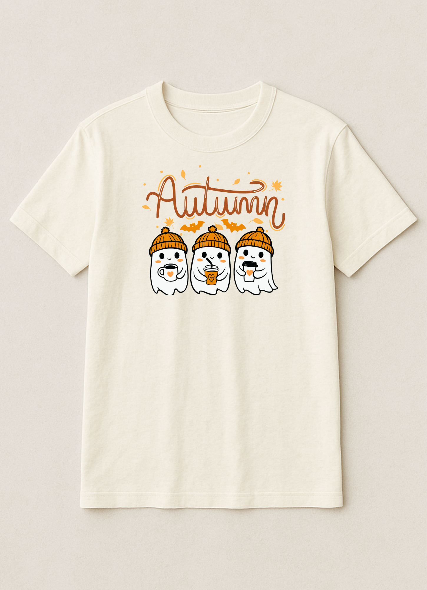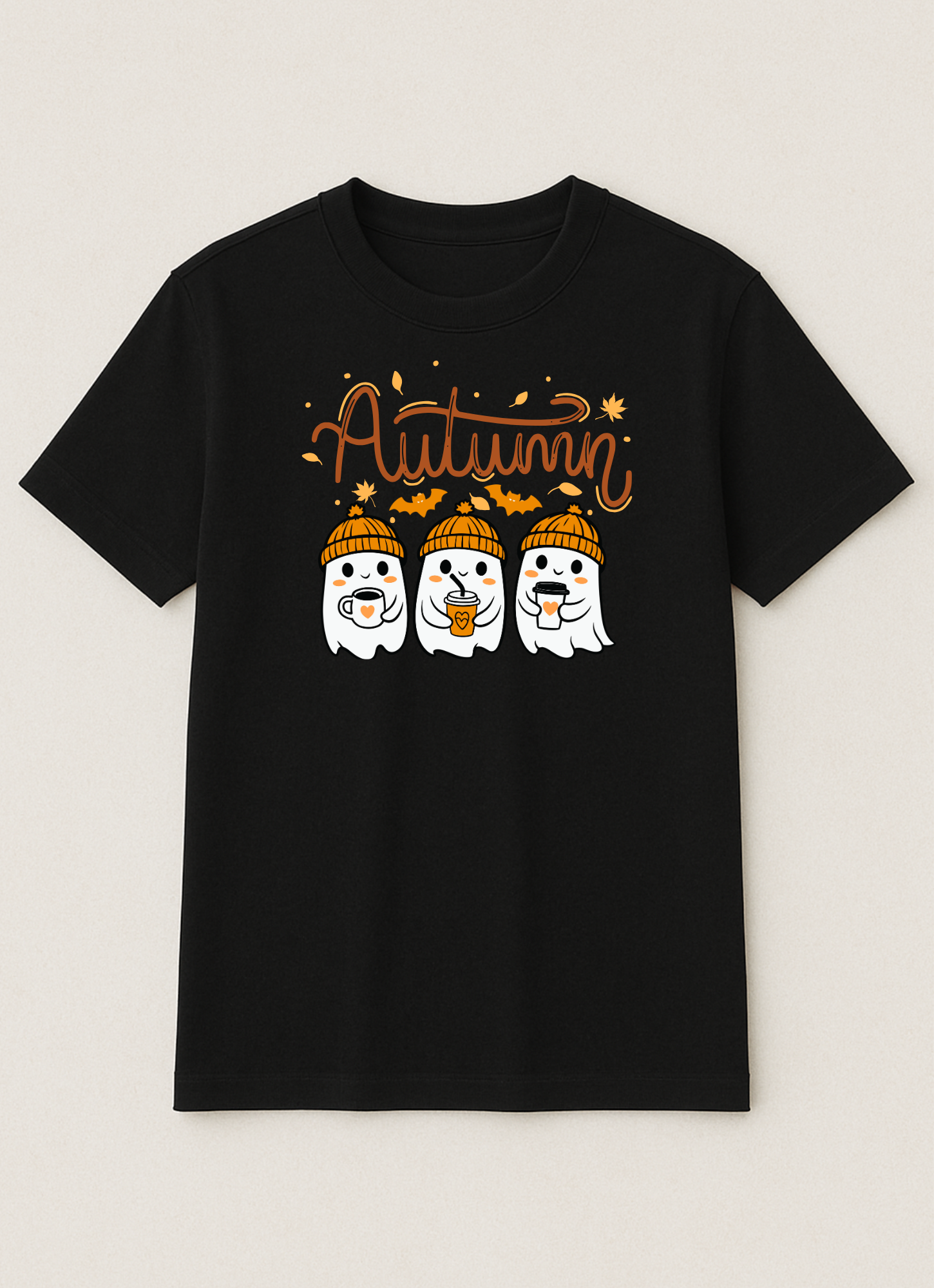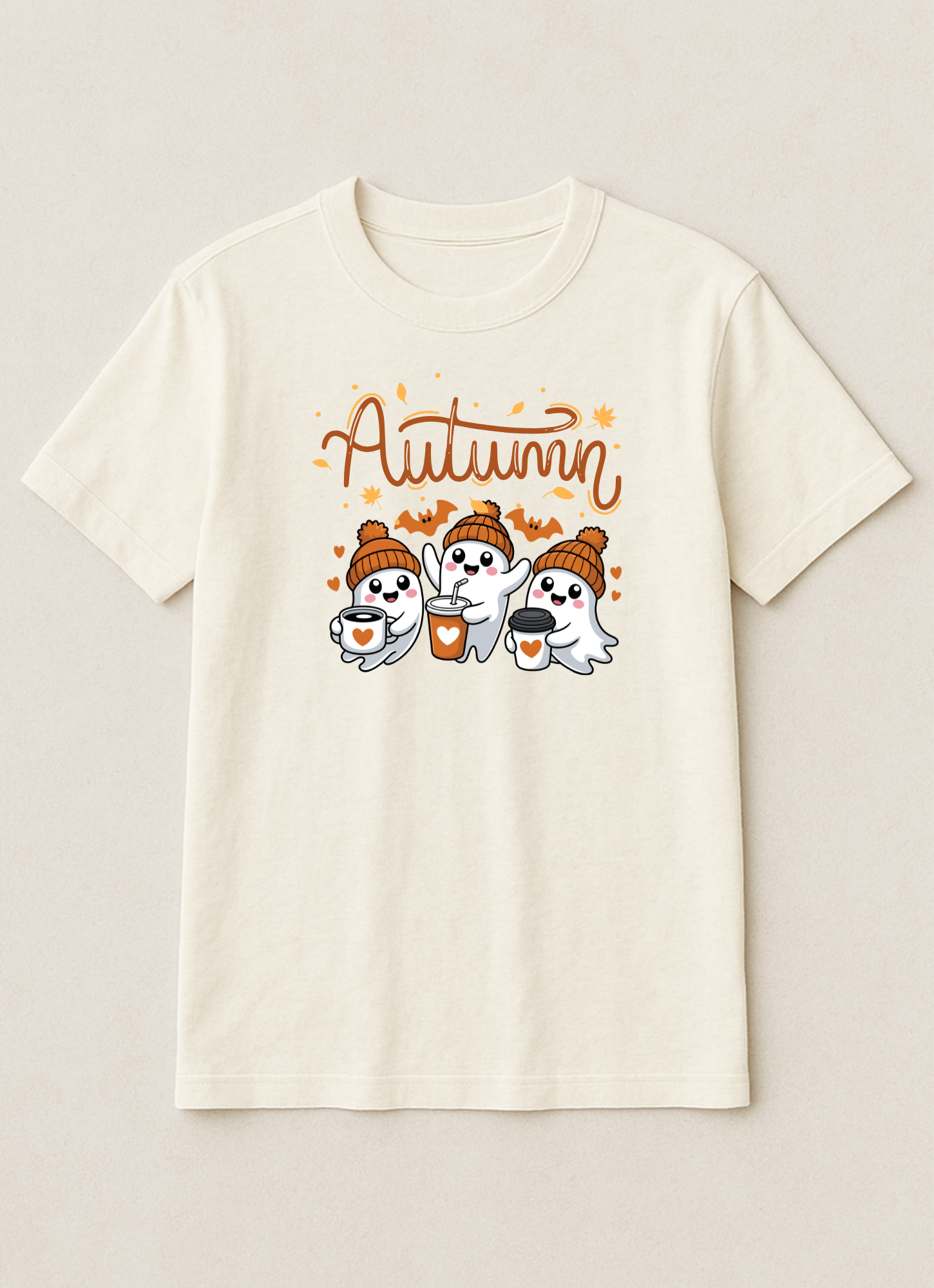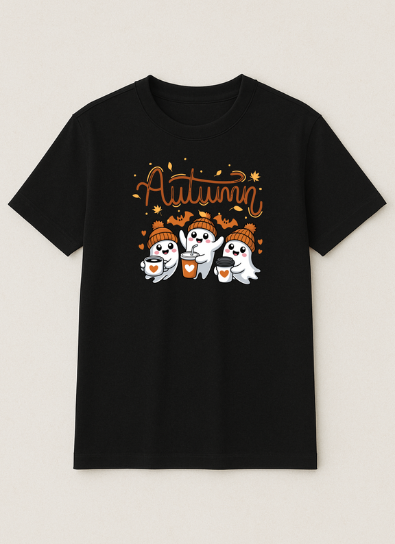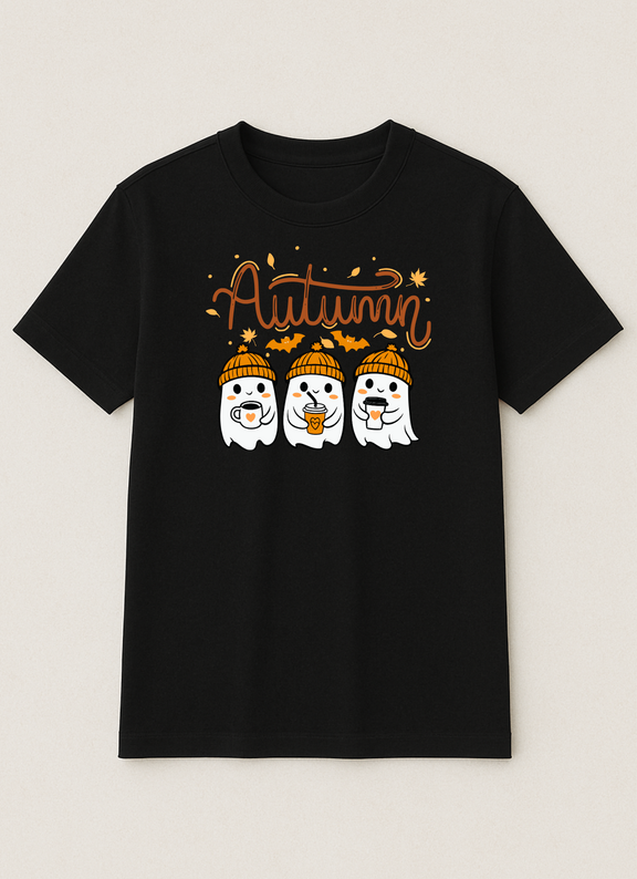 Cute autumn tee featuring cosy ghosts in beanies, warm drinks, and fall vibes — perfect for spooky season lovers.