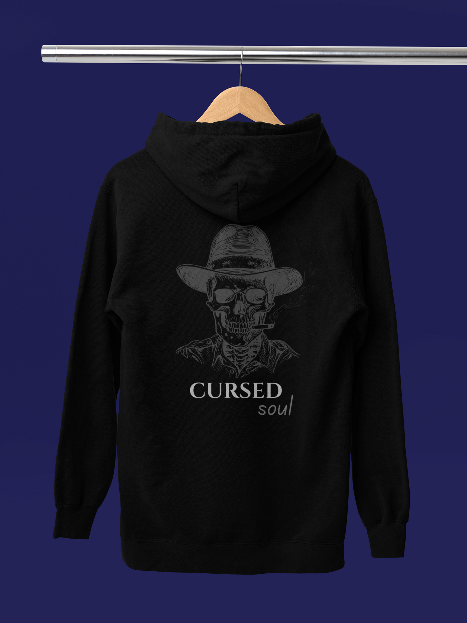 Embrace your dark side with this hauntingly cool design. A sinister smoking skull is paired with the powerful phrase "Cursed Soul," making a bold statement that's perfect for anyone who owns their dark aesthetic.