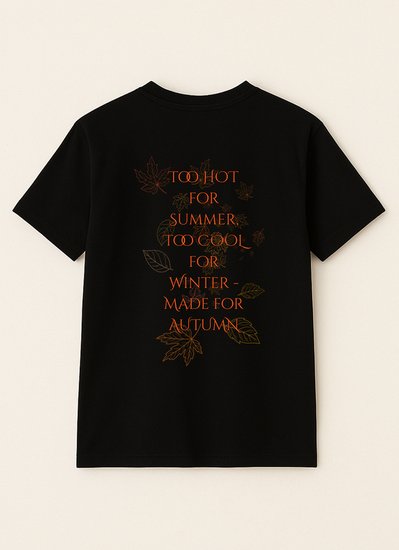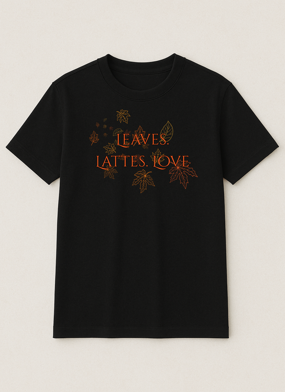 This cozy black tee captures the essence of autumn with the phrase "Leaves. Lattes. Love." and falling leaf illustrations. It's the perfect shirt for embracing all the best things about the fall season.