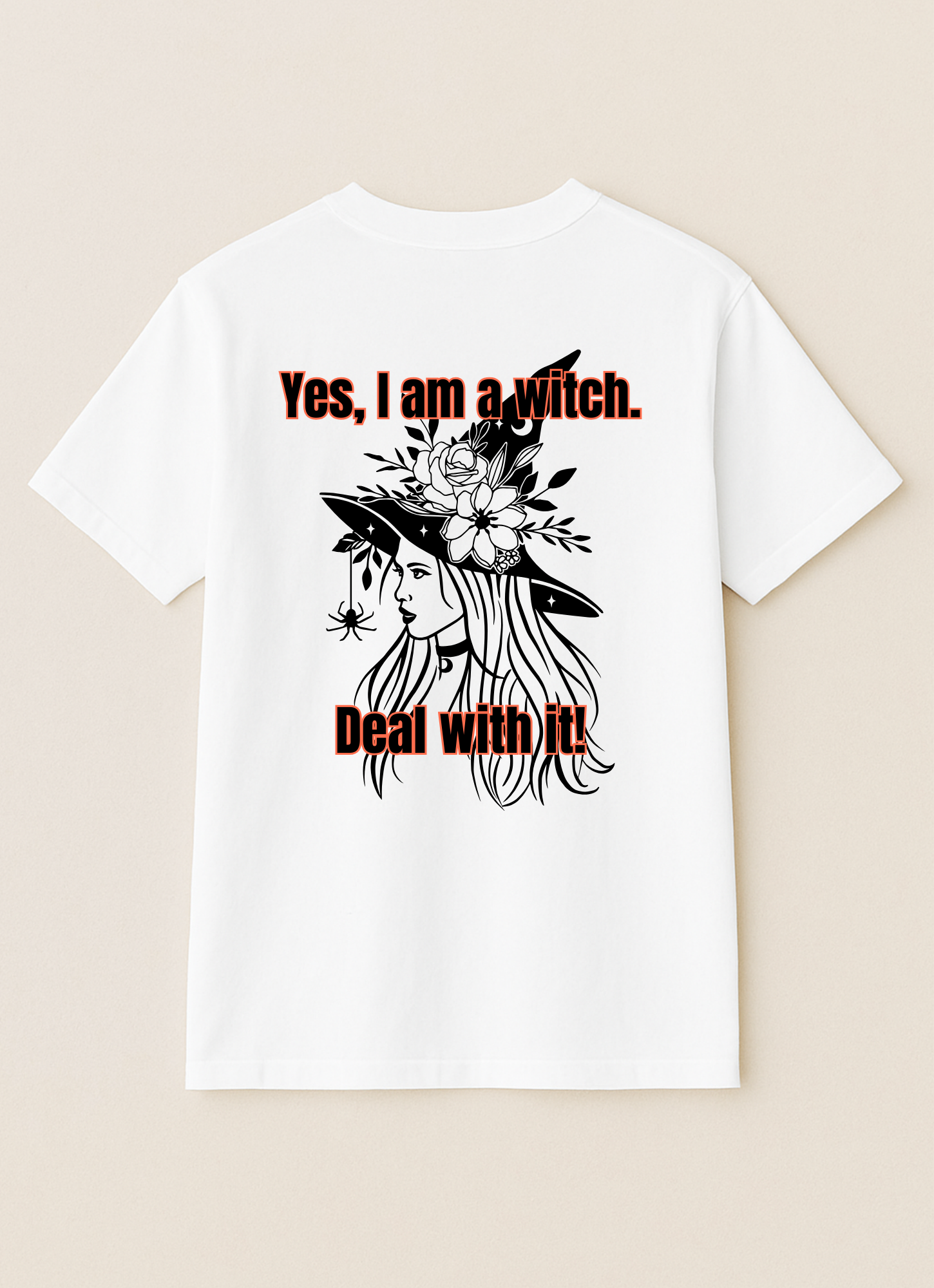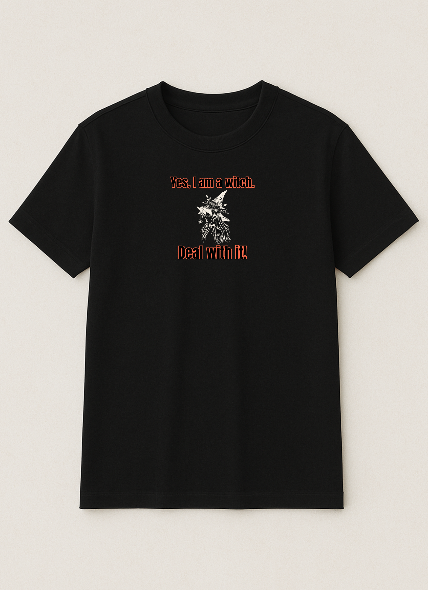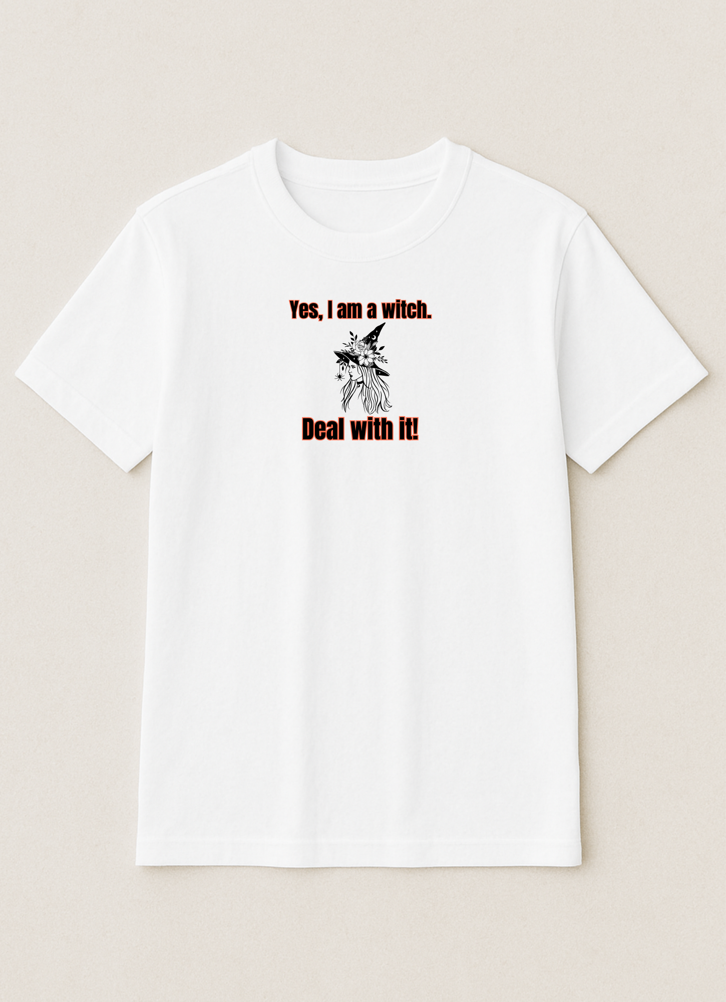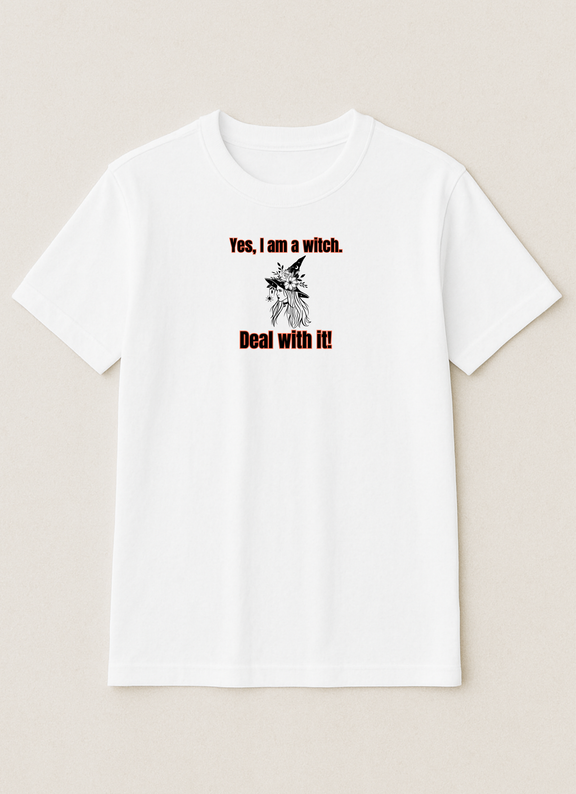 Embrace your power with this witchy tee! A stylish witch with flowing hair and a floral, spider-adorned hat makes a bold statement. The text, "Yes, I am a witch. Deal with it!", is perfect for anyone who isn't afraid to be their true self.
